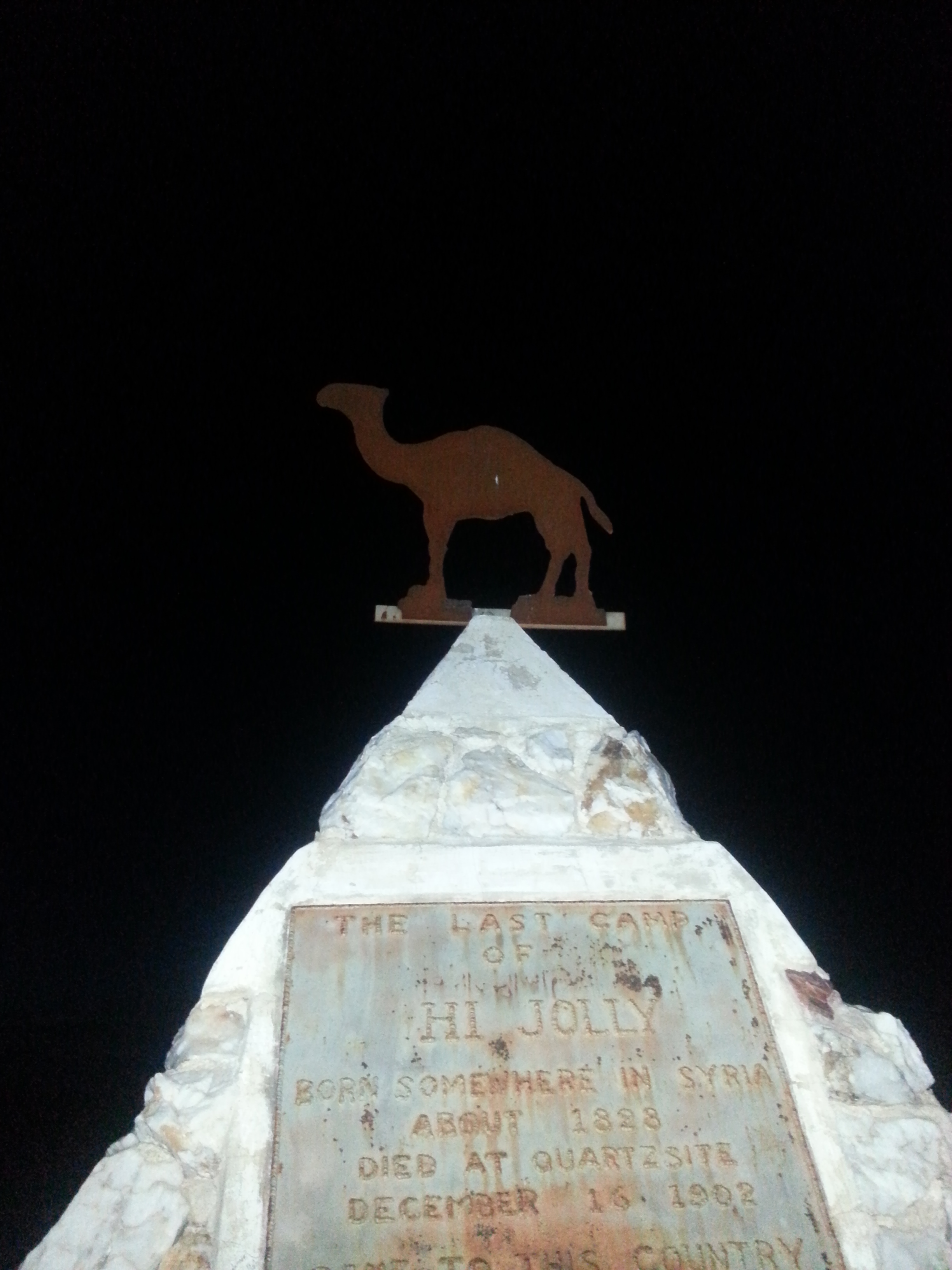 While driving between Los Angeles and Phoenix last week the Tomb of Hi Jolly was a must-visit. It’s located in a small cemetery off the 10. We hit the town just as the last sunlight was dipping over the horizon, so it took us awhile to figure out where the cemetery was located. If you get off the 10 and follow internet directions to go west, it’s likely you won’t see the sign pointing in the direction of the cemetery. As far as we could tell in the dark there is only a sign facing the road when you’re headed east down Main St. (just a tip if you venture out that way to pay your respects).