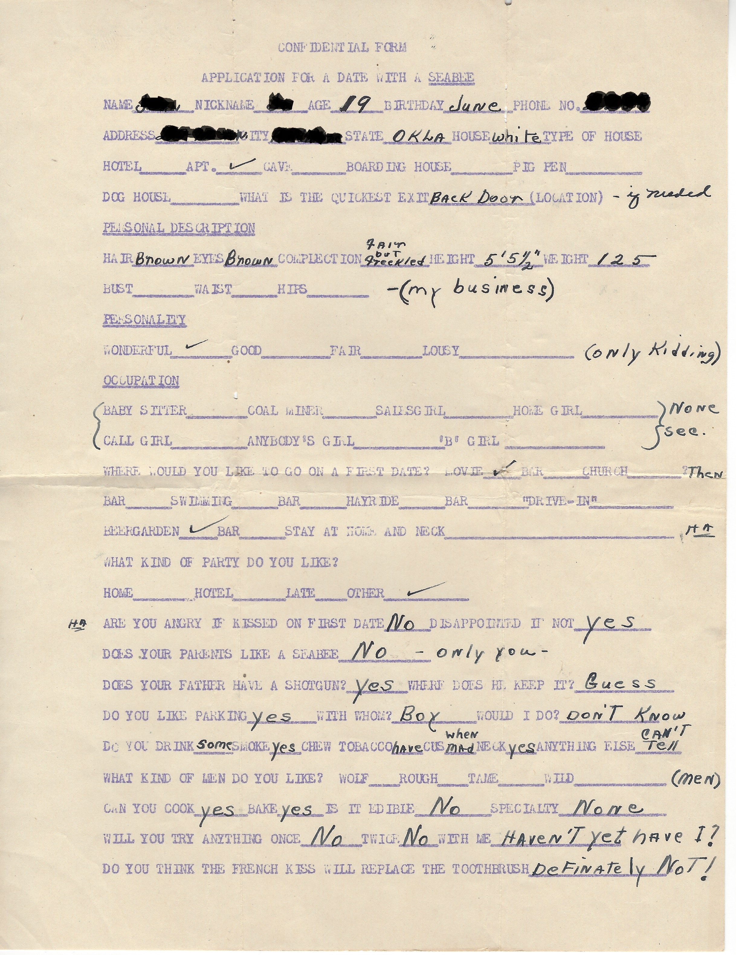 There’s a blank form and a filled out version in my grandpa’s papers, but the filled out one is way more fun! I don’t know the form’s origin story, but it’s fun to think about really serious questions like: do you think the french kiss will replace the toothbrush?